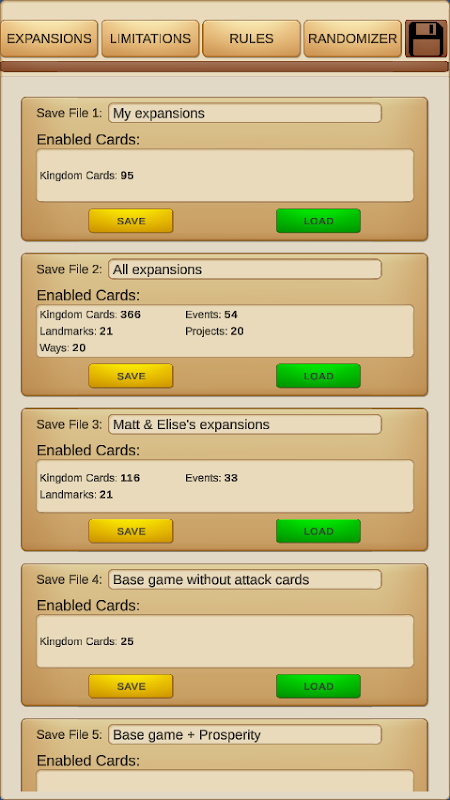 - Save up to 5 different loadouts (enabled expansion/cards and rules) for different kinds of play styles / groups