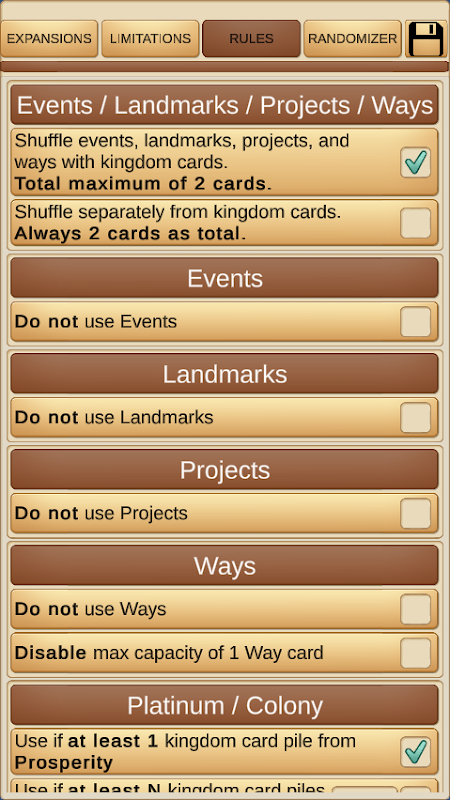 - Set minimum and maximum limitations per card type (e.g. treasure, attack, and Duration)
