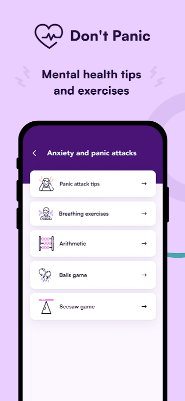 Anxiety and panic – breathing exercises, simple counting, mini-games, relaxation recordings, tips “What to do when anxious”.