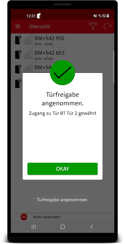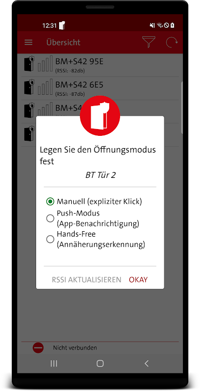The user of DoorSec goes into the area of the door and can initiate the door opening quickly and easily. The user can flexibly choose between 3 operating modes. These are the manual, semi-automatic and fully automatic modes. In manual mode, the user actively clicks into the app to open the desired door. In the semi-automatic mode, you get a push notification when the door is opened. The fully automatic mode opens the door directly without an additional click as soon as the user is within range of the module.
