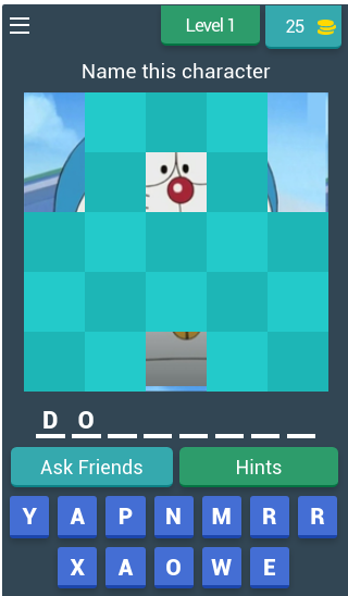 This will be a game where you will come across DoraemonGame Characters and pictures. Pictures will be covered out with bricks of which you can remove some to guess the object. Here a question will also be which will work as a hint for you. Then in the below section you will see cubes containing alphabets and you will have to make a combination of some of those alphabets to write the DoraemonGame Character and Gadgets name.