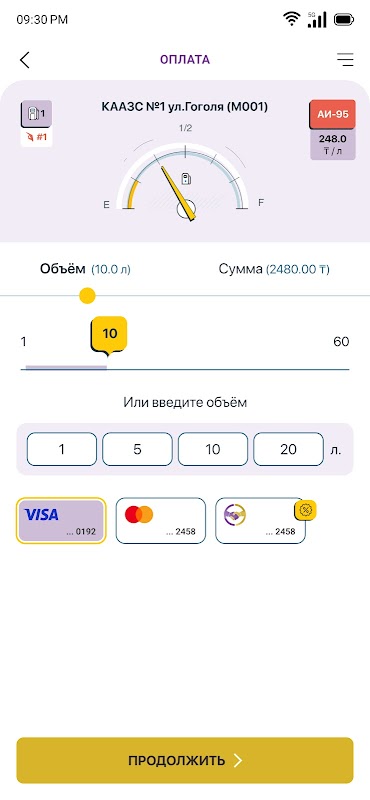Our mobile application provides an opportunity to refuel the car without going to the payment terminal. You just need to insert the gun into the gas tank!