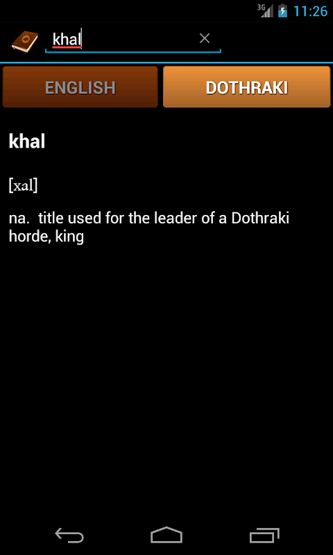 To use the app just select the language you want to translate from (English or Dothraki), start typing the word you want to translate in the search field and automatically a list of the available words will be shown. Press your desired word and the translation will be shown.