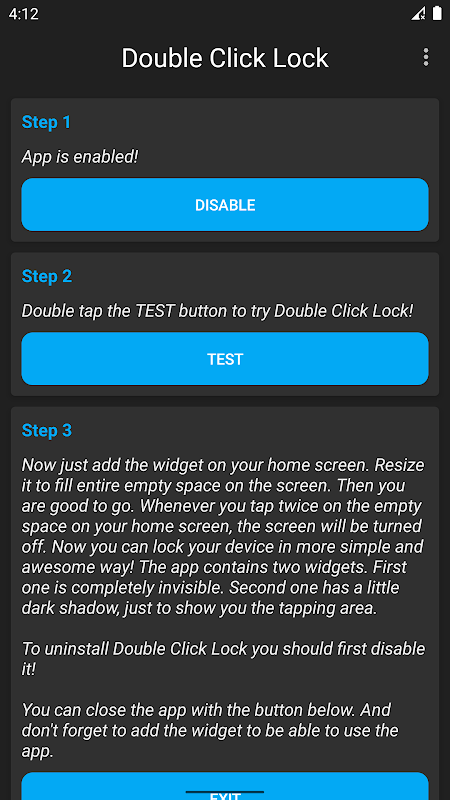 Double Click Lock Widget is very useful app. Most of the modern smartphones have double tap option to turn off and turn on the display. This app allows all devices, even older ones, to turn off display when user double tap on the homescreen. Fast, easy, and very handy!
