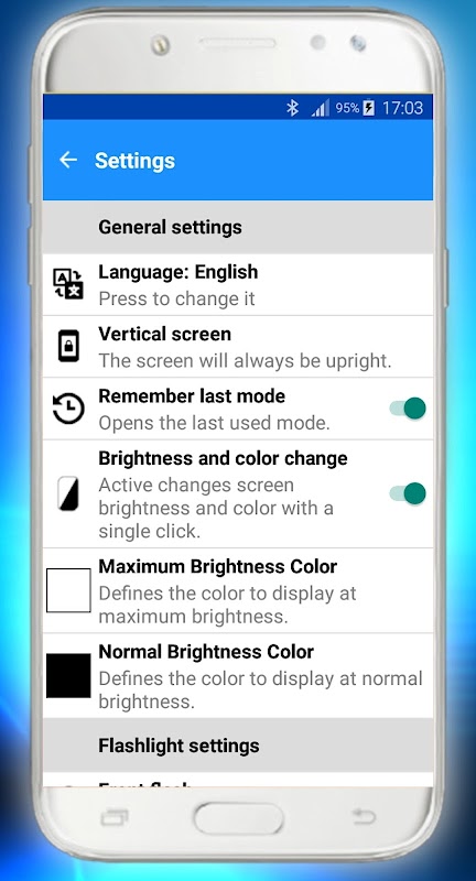 Control the camera flash as a flashlight, as well as the screen brightness as ambient light, thus allowing front and back lighting. It also has an ambient light meter and shows the battery level.