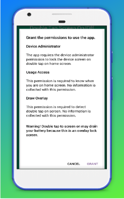 Double Tap Off / ON is an application that helps you protect the power button. Double Tap OFF On also allows you to turn off the lock screen quickly by touching the Home screen twice. Just a touch to lock and turn off the screen.