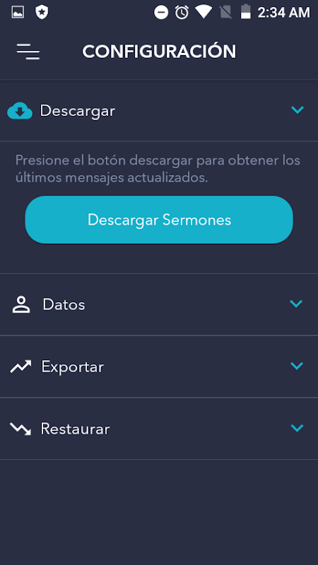 Configuration: Dove includes the configuration section to download the latest messages, data entry for sending your backup to your email, option to export and restore your notes.