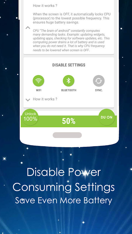 Best Battery Saver: Doze not only stops the power draining apps, it also prevent the settings to consume energy by disabling them. Settings like Bluetooth, Data, Sync etc keep running continually inn the background exhausting the power out of your device. With Doze you don't have to on and off these settings. Just choose the setting you want to disable and Doze disable that setting when the phone screen is off and setting will be enables the time you wake up your phone to use.