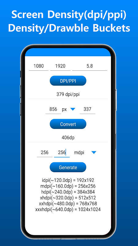 DPI converter enables you to check out device dpi of any display out there in the market such as handset, tablets, foldables, chrome book. Drawable buckets is grouped into idpi, mdpi, hdpi, xhdpi, xxhdpi , xxxhdpi.