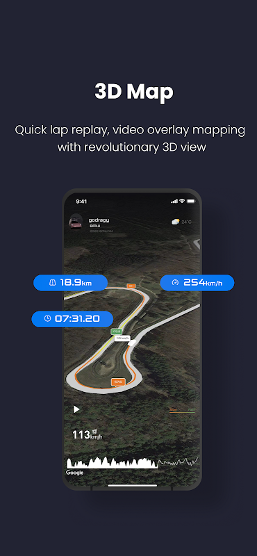 Record front and rear camera footage with overlays showing speed, G-force, lap times, and a dynamic 3D map.