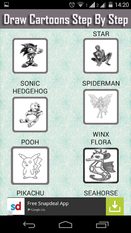 This app contains step by step drawing instructions for learning How To Draw Cartoon Characters.