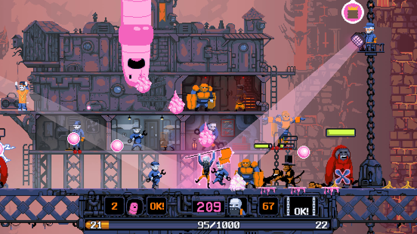 *Collect chickens and produce energy using a special, non-violent method to upgrade the city and unlock abilities. The city gives you NPC assistants and squad members, and abilities let Vladimir take down opponents in increasingly showy ways, like summoning a pink worm to slow your enemies then using a giant wrench to deal a devastating blow.