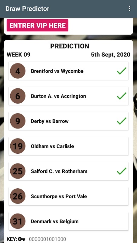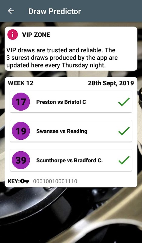 Some patterns repeat over time and whenever that happens, some draws are very sure. This app analyses over 480 previous weeks to generate sure draws. Each weekend, there will be about 7 free draws and 3 sure draws for VIP.