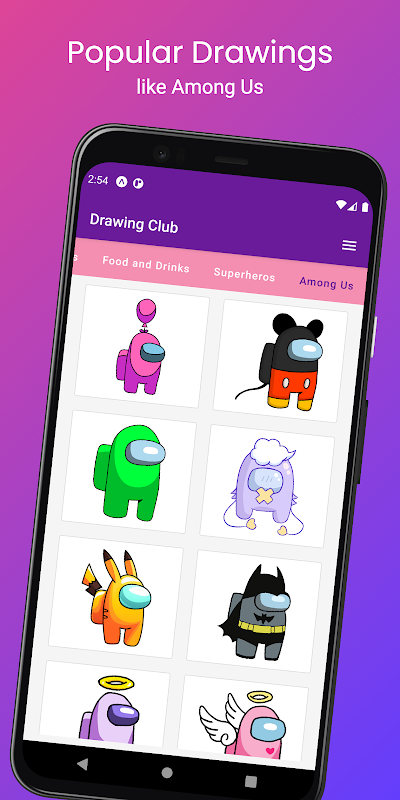 Drawing Club is a free drawing app for everyone, provides easy animated steps to teach you how to draw hundreds of cute cartoon drawings such as Unicorn, Among Us, Kawaii, Animals, etc.