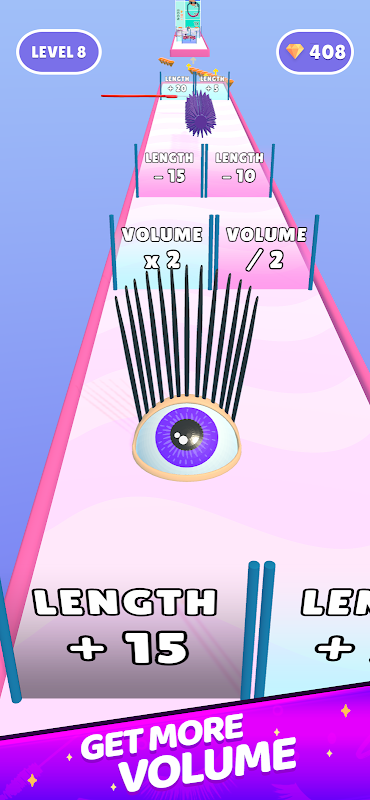 Control your eye, choose between gates to improve your look. You can either choose volume or length to make your lashes more amazing. Green length gates will give you longer lashes, and green volume gates will make your lashes bigger. Avoid red gates and obstacles that will harm your lashes. There are colorful mascaras on the road, you can color your eyelashes to give them a better look. Be bold!