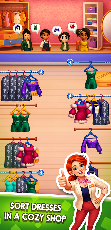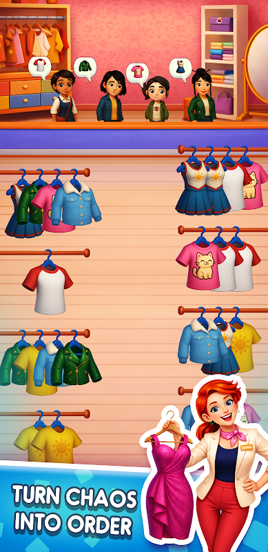 In this elegant puzzle game, you sort clothes by matching 4 identical items, moving them between clothing racks in a fashion store. Each level brings a new customer order that needs the perfect arrangement.