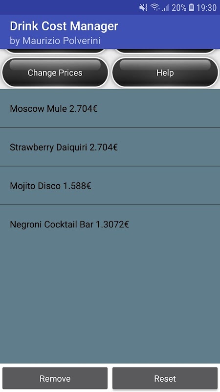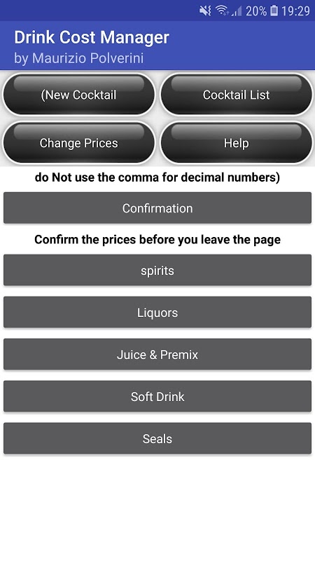 You can also modify manually every single ingredient's cost from the menu: spirits, liquers, juices, premix, soft drinks, everything that it is necessary to build your own cocktail.