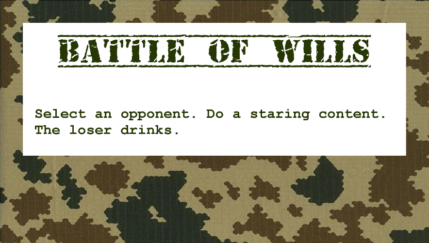 This is a drinking game for real men. You and your buddies are soldiers in the army. Everybody in turn receives orders which must be completed.