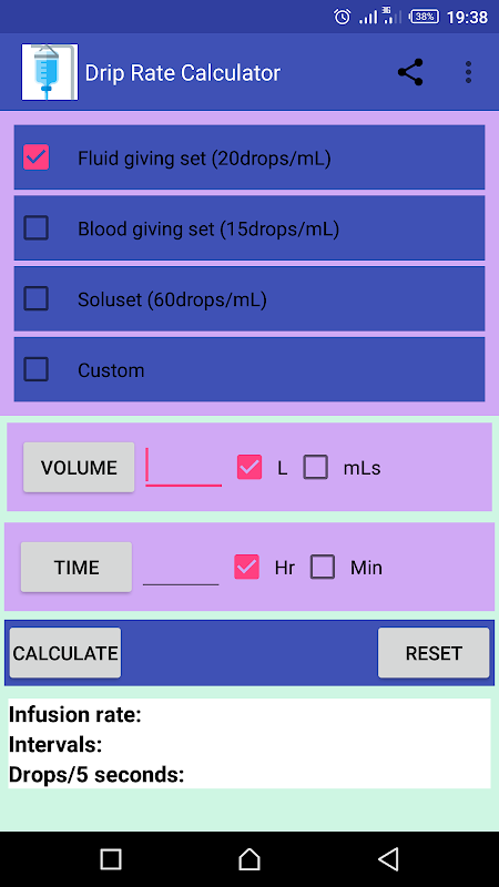 Drip rate calculator provides a smarter way to calculate for drop rate to deliver a given volume of fluid over a period of time.