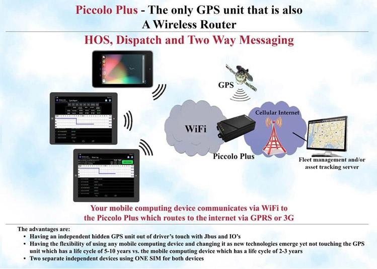 2. DriverLog installed on an Android tablet that communicates via WIFI to our Piccolo Plus that in addition to being a telematics unit sending GPS, Driver Behavior, J1708 or J1939 or OBDII data to the fleet management system is also a wireless router providing a local WIFI Hot Spot for the tablet to communicate to the cloud via the Piccolo Plus.