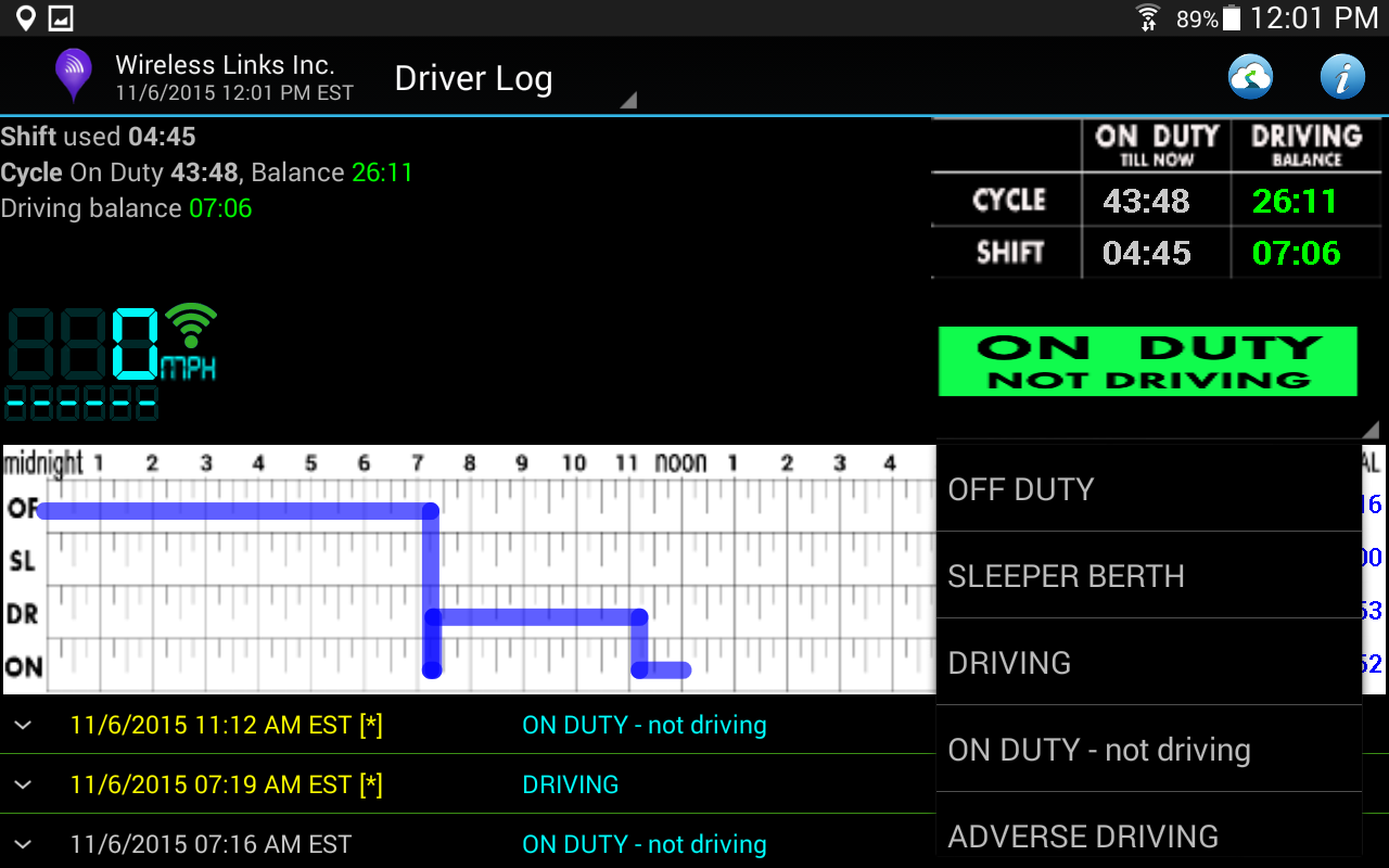 • Automatically uploads via cellular or WIFI every event real time to the server so the dispatcher has a complete real time visibility of the drivers’ status within the HOS shift and cycle.