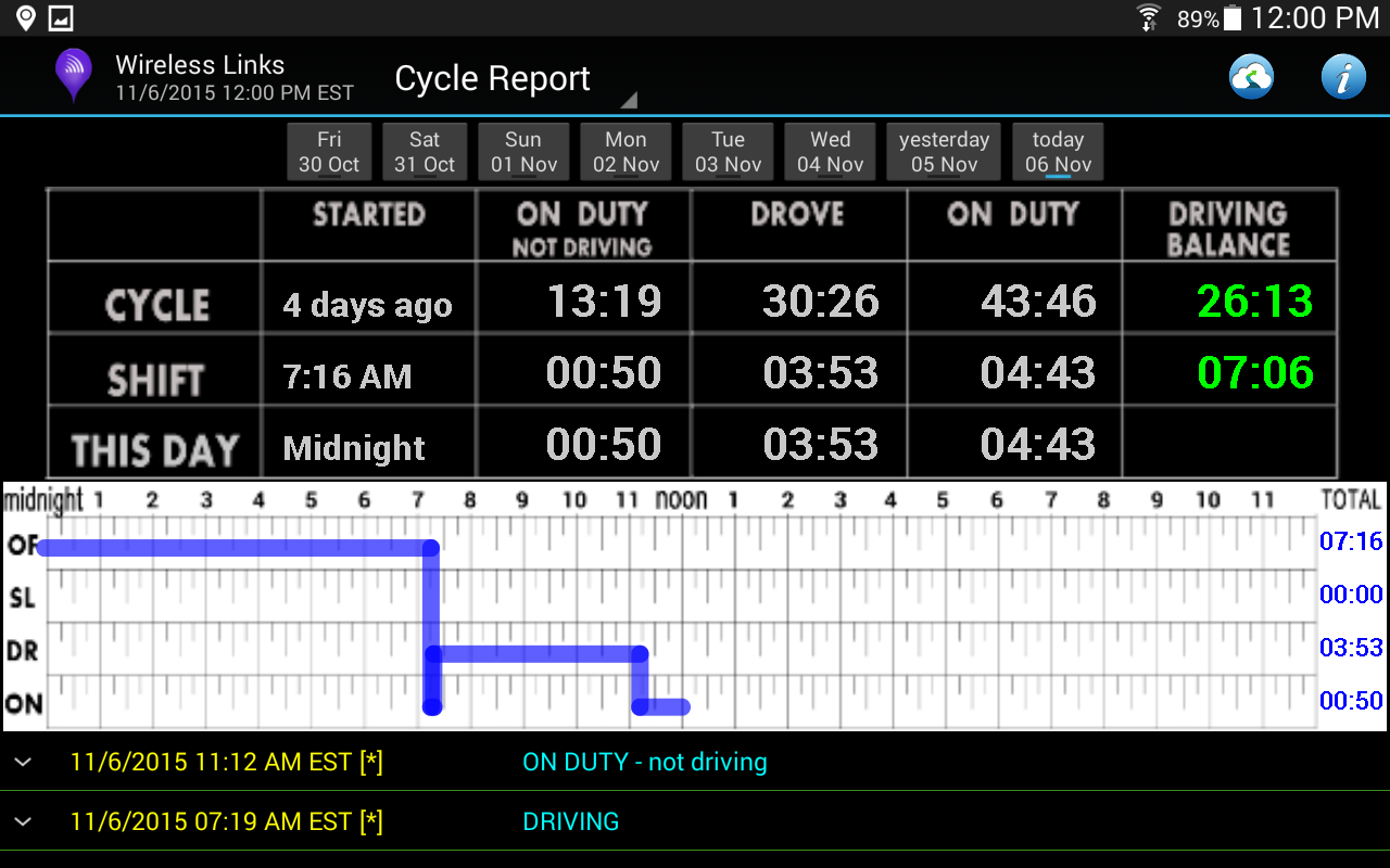 • Automatically calculates and displays current and available driving and on duty time in drivers’ shift and cycle.