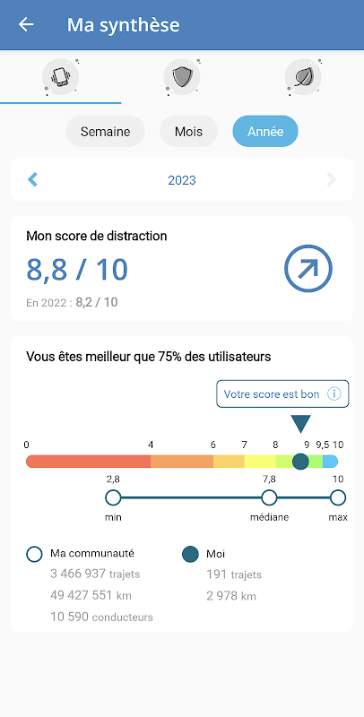 - Safety, eco-driving, distraction score and weekly statistics.