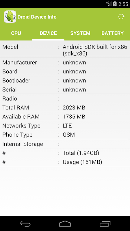 Droid Device Info shows detailed information about your Android smartphone and tablet including device hardware, system status, memory, camera, battery and sensor details.