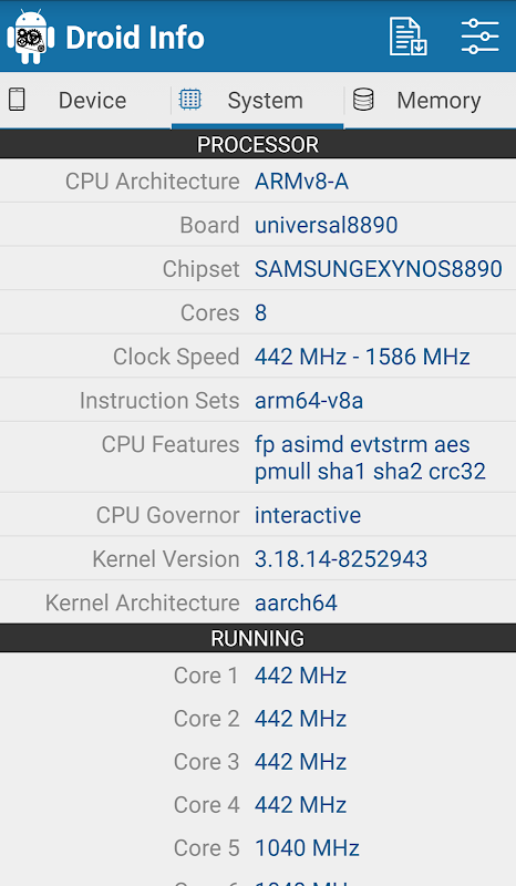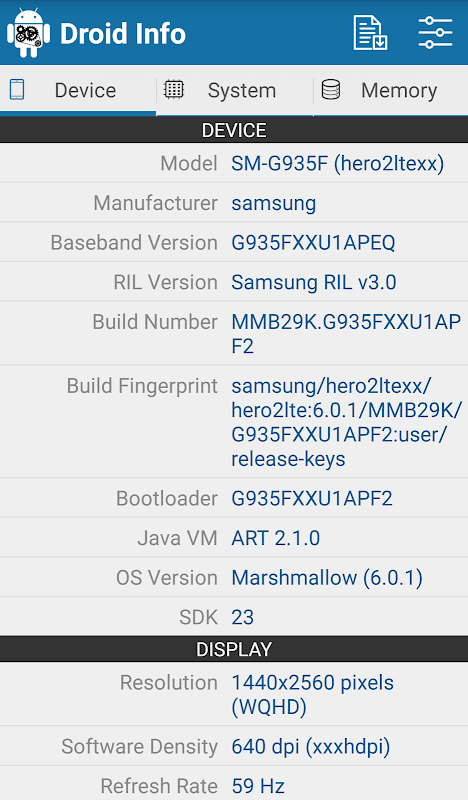 Droid Info is a hardware information app for Android with detailed information about your smartphone including device, system, memory, camera, temperature, battery and sensor details. You can also export full report of your Smartphone.