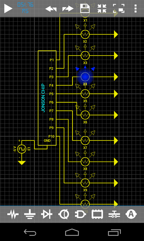DroidTesla simulator solves basic resistive circuits using Kirchoff’s Current Law (KCL)