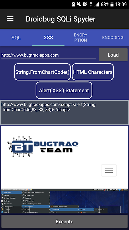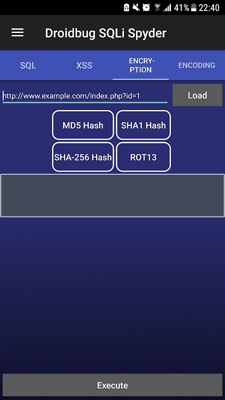 Droidbug SQLi Spyder integrates a hackbar for testing, inlcuding: