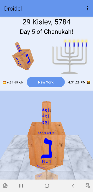 Droidel is an Android version of the game of Dreidel. Dreidel is a game of chance played on the Jewish holiday of Chanukah. Listen to Chanukah music while the realistic 3D Dreidel spins! Watch the Menorah during Chanukah to see the candles!