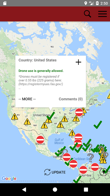 *DroneMate has a user comment system where travelers can add their experiences droning, importing, and dealing with authorities in each specific country. The comments are useful in situations where the authorities themselves are confused or unaware of the laws, non-common situations, and other anecdotes that can help other travelers.