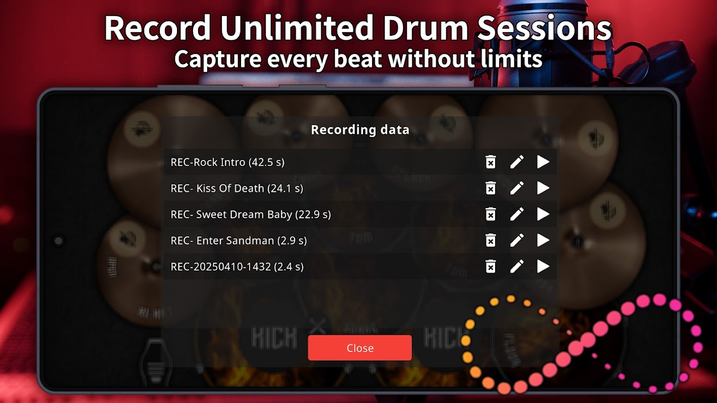 Capture your best grooves and beats anytime. Drum King offers unlimited drum session recording with crystal-clear audio. Perfect for practice, performance, or even song production!