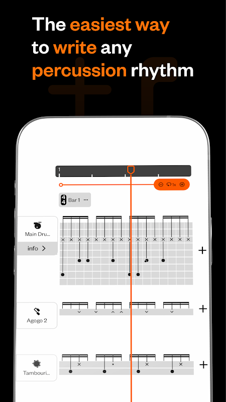 Drum Notes features an intuitive score creator, perfect for drumset and percussive genres like Samba, Marching Bands, Drumlines, Cuban percussion, and Drum grooves.