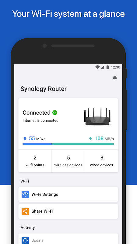 DS router allows you to manage you network with just a few taps whenever you want, wherever you go. Easily set up brand new Synology Routers, monitor live traffic, and protect your children's Internet activities with the comprehensive features of DS router.