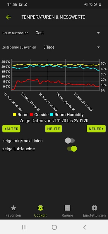 • Cockpit: the cockpit shows the current energy consumption and that of the last 7 days, weather and climate readings, current alarms and warnings, and user-defined states. In the detailed view of energy consumption, the individual circuits are displayed to the second. The climate data details show the temperature and humidity readings from the past days and weeks..