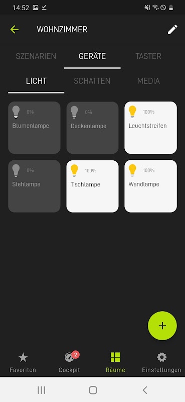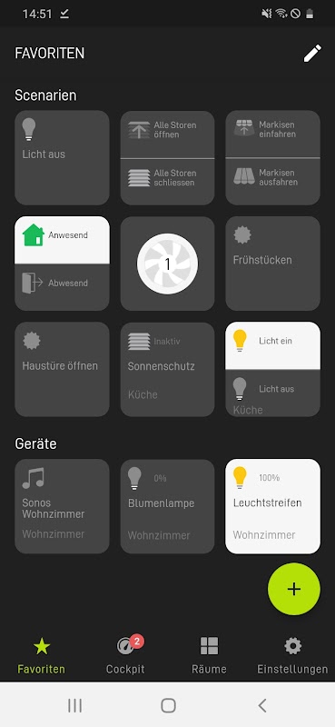• Favorites: In the Favorites the most important scenarios of the whole flat are displayed. And you can add your personal favorites. These can be scenarios from the rooms, individual devices or user-defined actions.