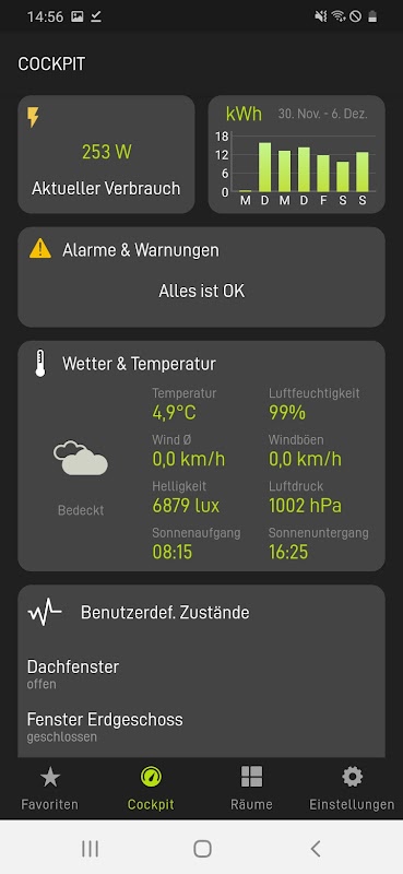 In the cockpit you will find information on current alarms and weather warnings, the user-defined states as well as the current energy consumption in your home.