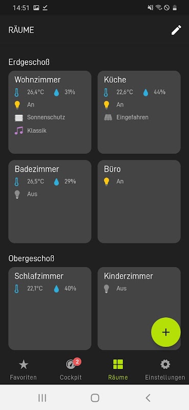 The app has four tabs (Favorites, Cockpit, Rooms, Settings) that help you to quickly switch between different features: