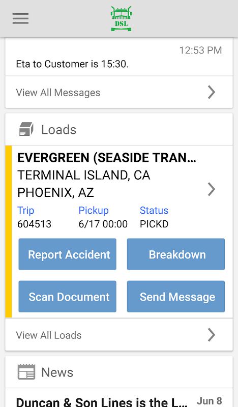 The DSL Mobile application was designed with you, the driver, in mind. You can do many things with this app: update your dispatch status, view maps, view weather, send & receive messages, scan & send documents, view news, report safety issues, and much more from anywhere you happen to be.