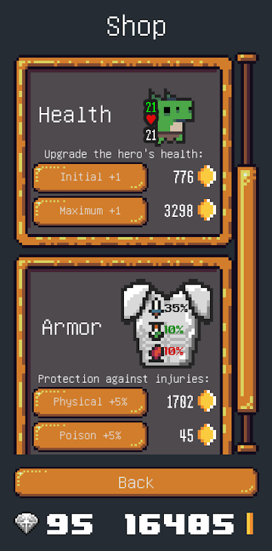 Beaten monsters left gold for which you can buy an upgrades (like health and armor) to became a stronger hero and be ready for more advenced levels! Search of epic treasure!