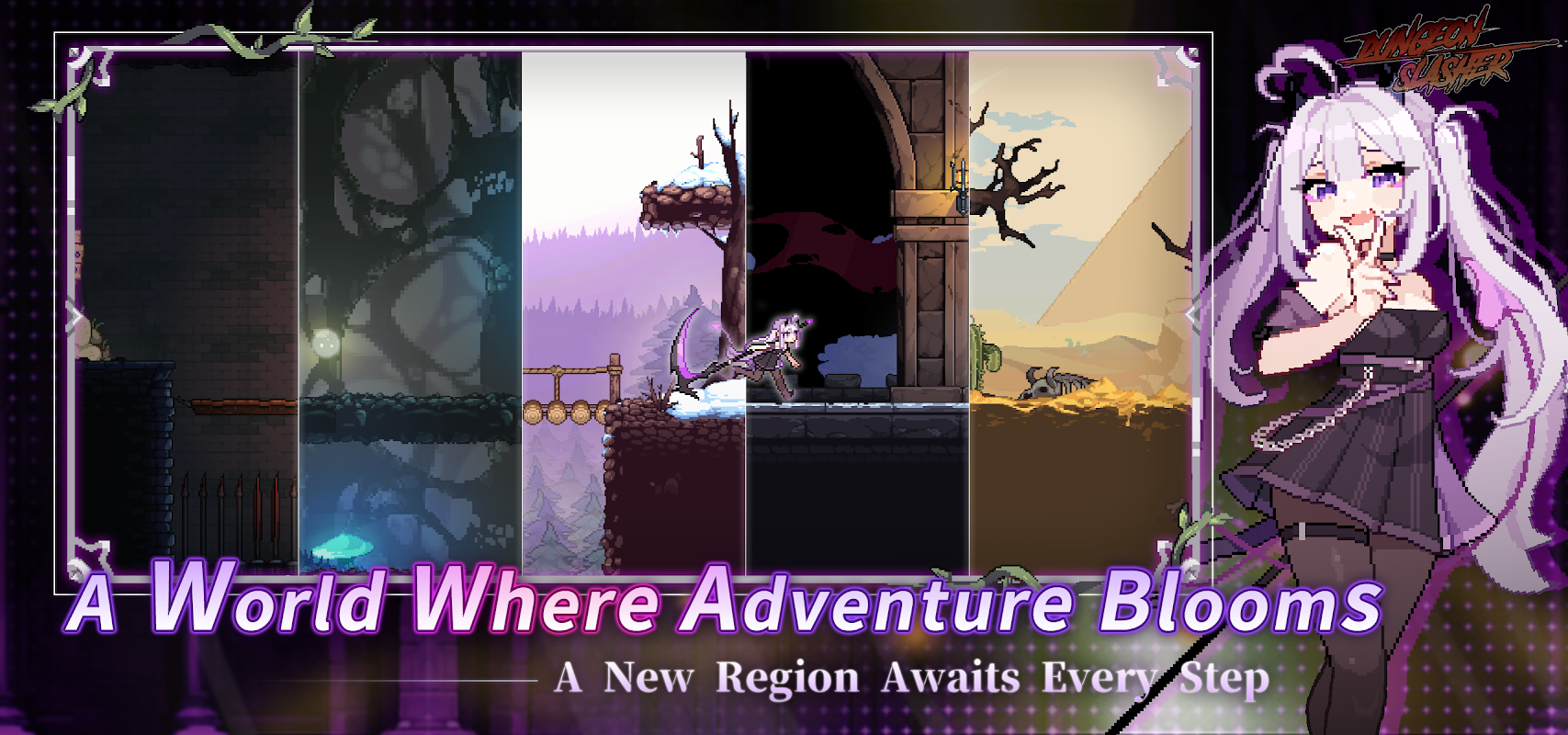 "Dungeon Slasher" is a roguevania pixelated side-scrolling action game, where you battle powerful enemies and bosses in thrilling 2D combat, utilizing the weapons and skills of diverse characters.