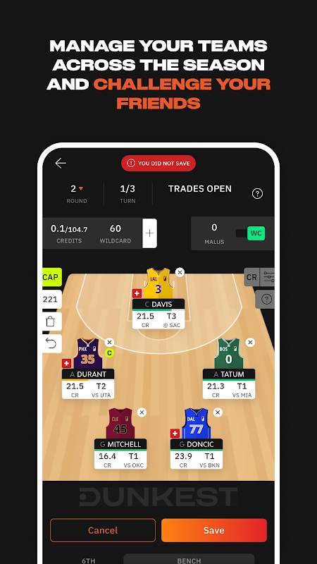 2) Dunkest Credits: Every player and coach has a value in Dunkest credits that changes based on real NBA performance. Manage your budget and make strategic choices to stay ahead.