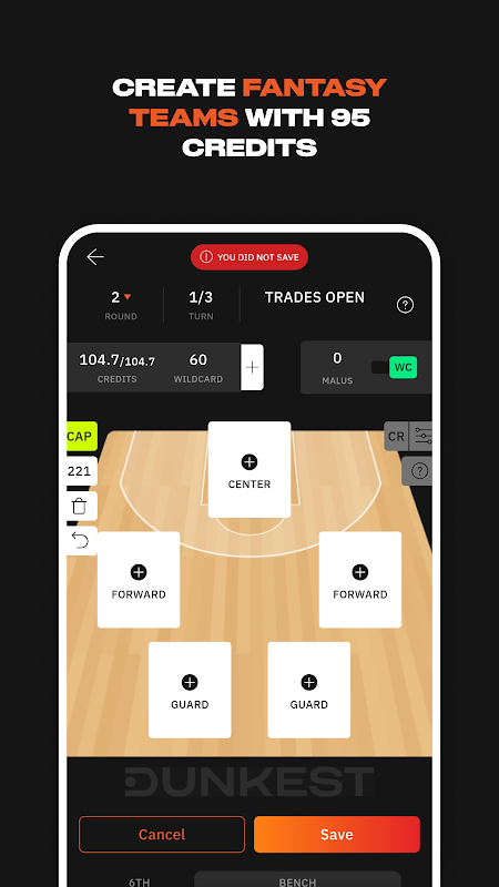 1) Create Your Team: Start with 95 Dunkest credits to build your roster: 2 Centers, 4 Guards, 4 Forwards, and 1 Coach. Pick wisely and craft your winning lineup!