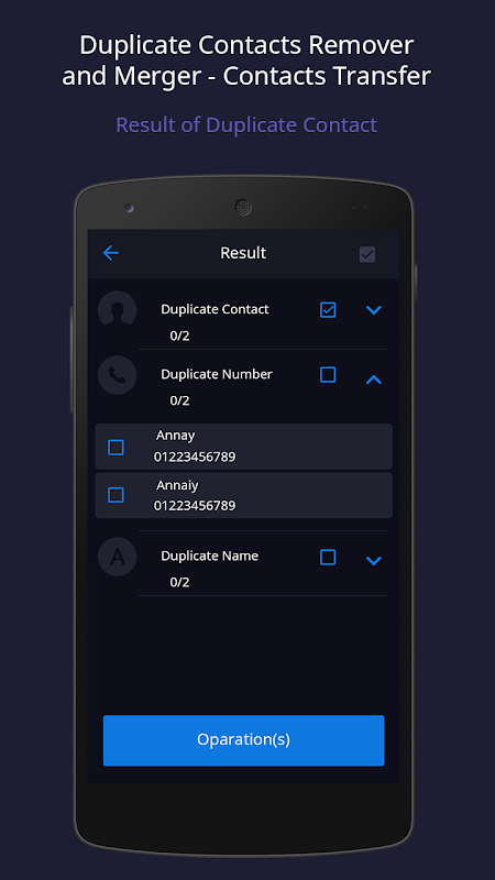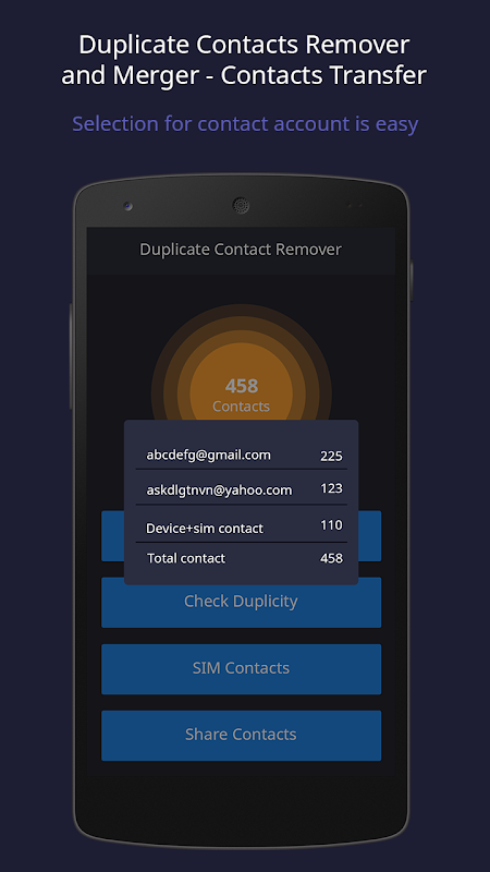 Remove Duplicate Contacts is by far the best contact management app solution available on your Android user to remove multiple duplicate contacts in your address book instantly. After Removing Duplicate Contacts has worked its magic, your address book will be cleaner, faster and easier to navigate. Duplicate contacts remover and merger - Contacts Transfer Remove same name, number of a single person and merge them in one contact. You can see a list of contacts sorted by name or by number and you can select which to delete.