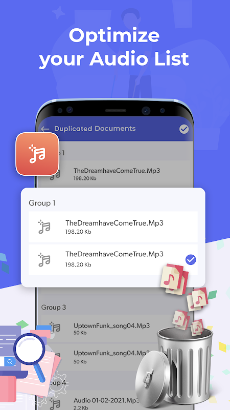 Duplicate music remover and cleaner delete similar music files and delete duplicate songs from your device. Duplicate songs finder finds all the duplicate songs in your device and then finally deletes duplicate music files instantly. Duplicate File Delete: Free Duplicate File Fixer is an excellent app available on the Play Store.