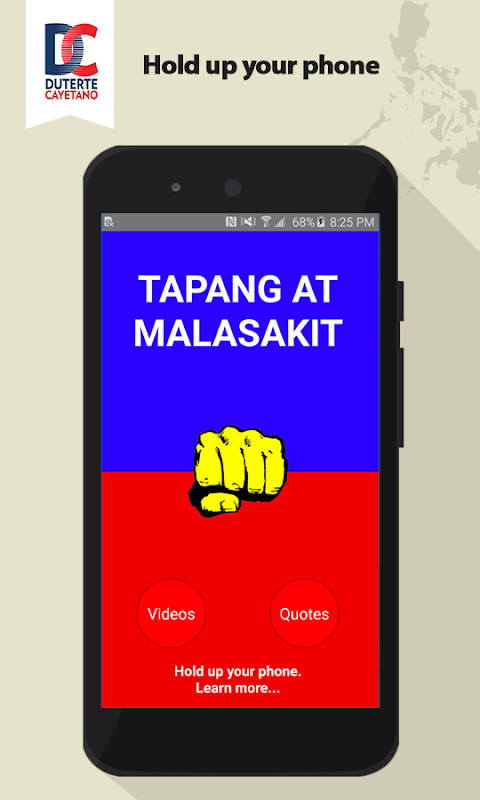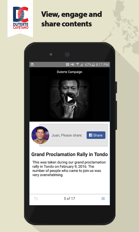 Volunteer in the Duterte Campaign's Social Media initiative. Become part of the Team. This revolutionary app represents Real People Power in the Age of Mobile. Help the campaign get their message out to your friends and social networks. Help counter the black propaganda being generated by the competitors. Receive notifications when the Mayor needs you to take action and then... Tap, tap... done. After we win the election, the fight for the Filipino people will continue. This app and the network it creates will be used to mobilize support for the Campaign's platform. Tapang at Malasakit
