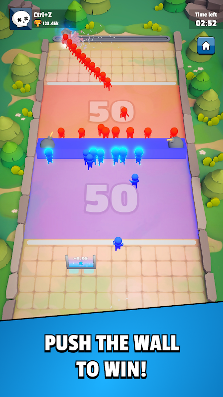 Win by pushing the wall into the enemy zone, or having the lead when time runs out