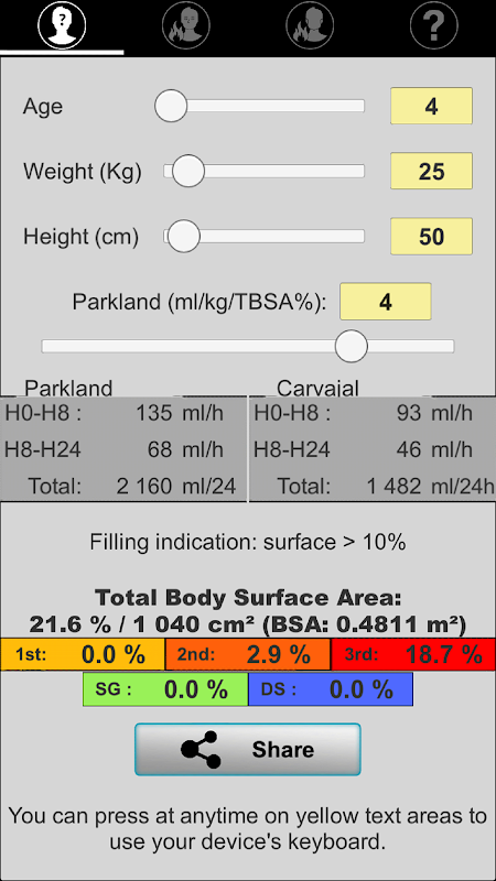 Application aimed at guiding initial fluid management (adults and children) after drawing the burned surface on a template (Lund and Browder chart).
